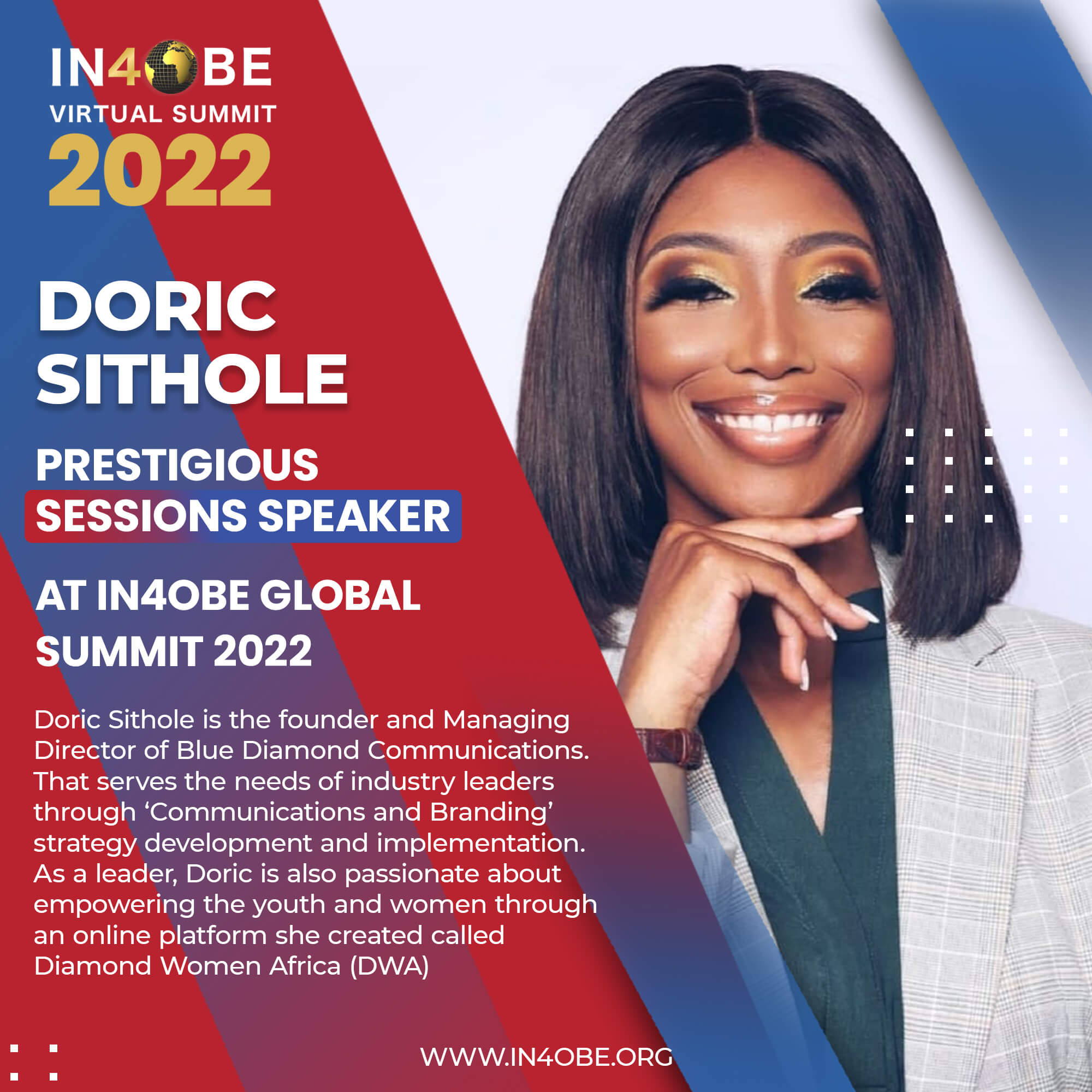 Doric Sithole is the founder and Managing Director of Blue Diamond Communications a company that serves the needs of industry leaders through ‘Communications and Branding’ strategy development and implementation. She is also an accredited Facilitator, a Speaker and Master of Ceremonies. Doric believes the best investment one can make in order to lead in any industry is to nurture the ‘Communication’ skill so you can show up confidently and influence change positively using what she calls the ‘Power of Confidence’. Communication is definitely her first love and her training sessions and talks are always coupled with an emphasis on personal/corporate branding with a touch of authenticity.She delivers her content using a transformational method of teaching so individuals are able to reflect on their own assumptions and make a decision to take responsive action so they can continue to learn and lead with excellence. As a leader, Doric is also passionate about empowering the youth and women through an online platform she created called Diamond Women Africa (DWA). African women and girls are encouraged to ‘unearth the diamond within’ which refers to discovering the authentic self so you can live a purpose driven life and thrive. DWA also showcases women leading in different sectors through workshops with an emphasis on storytelling and the resilience they have shown in their work.Doric’s Mantra: “Be fearless in the pursuit of what sets your soul on fire” – Jennifer Lee