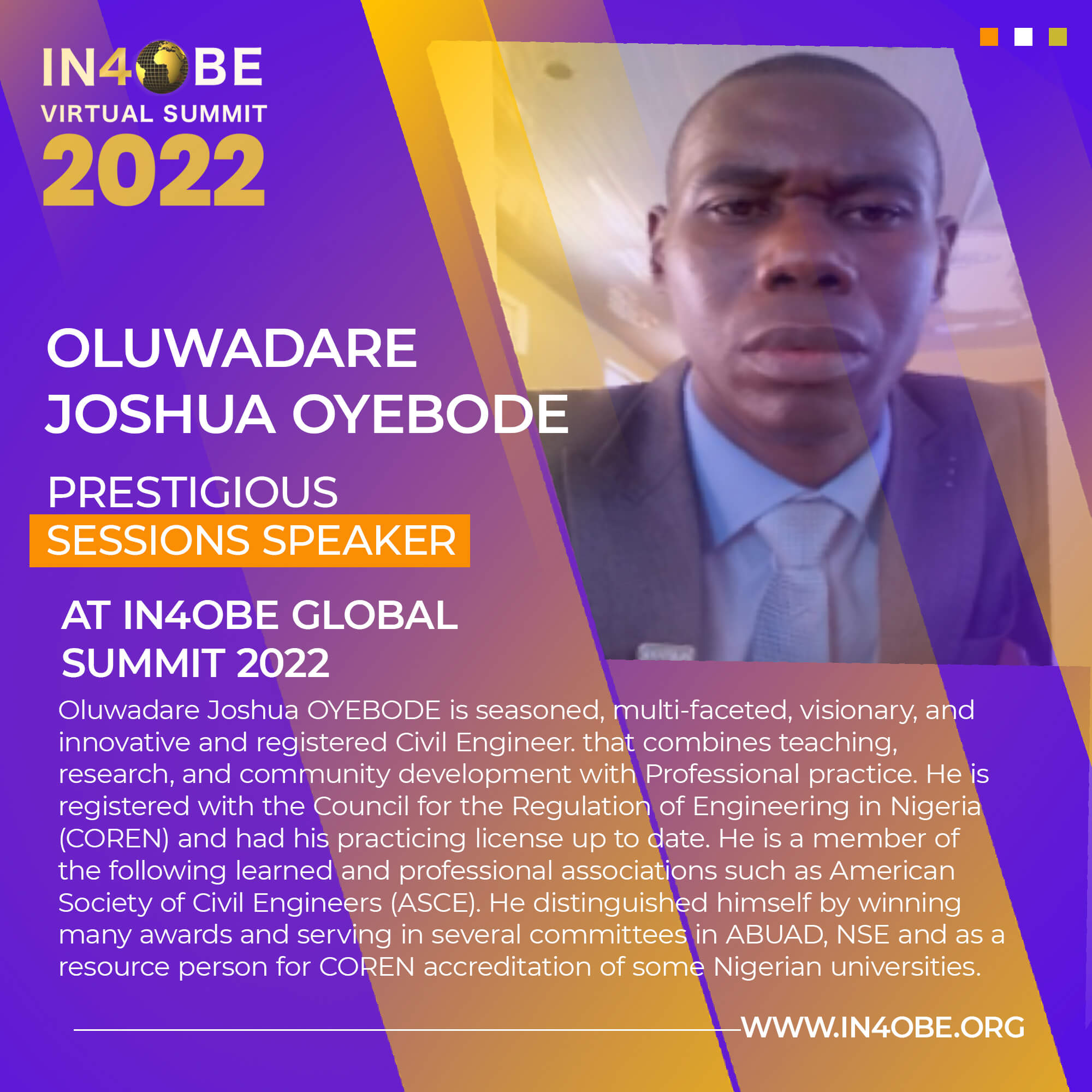 Oluwadare Joshua OYEBODE is seasoned, multi-faceted, visionary, and innovative and registered Civil Engineer that combines teaching, research, and community development with Professional practice. He had paper publications in conferences, reputable local and international journals. He has displayed extensive ingenuity in his professional practice with an unusual personality of multiple and variegated credentials. His achievements and antecedents in all the facets of the profession are testaments to his visionary and undiluted commitment to societal development.